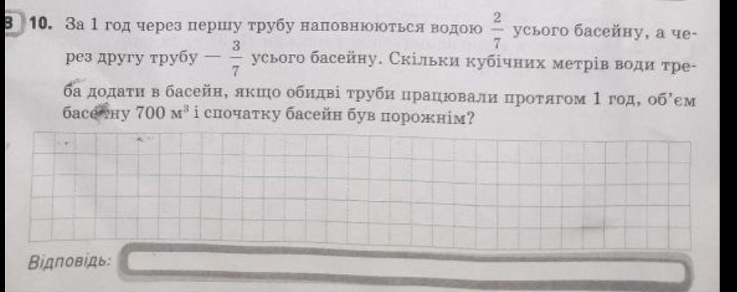 2 3 10. За 1 год через першу трубу наповнюються водою - усього басейну, а че- 7 3 рез другу трубу - 7 усього басейну. Скільки кубічних метрів води тре- ба додати в басейн, якщо обидві труби працювали протягом 1 год, об'єм басе ну 700 м3 і спочатку басейн був порожнім? Відповідь: