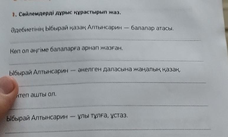 6-сабақ. Тұңғыш ұстаз 1. Сейлемдерді дұрыс құрастырып жаз. Әдебиетінің Ыбырай казак Алтынсарин балалар атасы. Кеп ол әңгіме балаларға арнап жазған. Ыбырай Алтынсарин ктеп ашты ол. Ыбырай Алтынсарин -- әкелген даласына жаналык казак. ұлы тұлға, ұстаз.