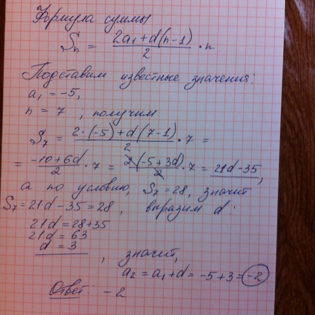 a1=-5, S7=28, найдем d= 3.