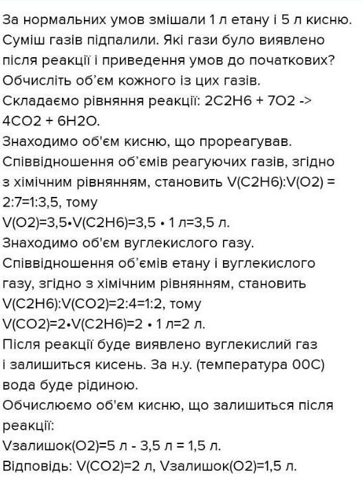 За нормальних умов змішали 1 л етану і 5 л кисню. Суміш газів підпалили. Які гази було виявлено після реакції і приведення умов до початкових? Обчисліть об’єм кожного із цих газів.
