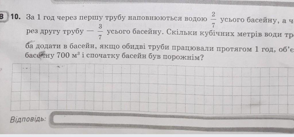 2 труби разом за 1 годину 2/7+3/7=5/7 басейну, тобто долити треба 1 -5/7=2/7 басейна = 2/7 *700=200 куб.м.