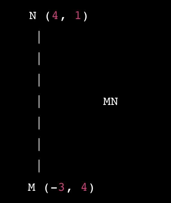 На той же координатной плоскости нарисуйте точку N, которая находится на 4 по оси x и на 1 по оси y.Соедините точки M и N линией.