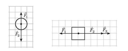6. На рисунку зображено два тіла та сили, що на них діють (1 клітинка – 1 Н). Для кожного випадку визначте модуль рівнодійної. (На скрине, номер 6)