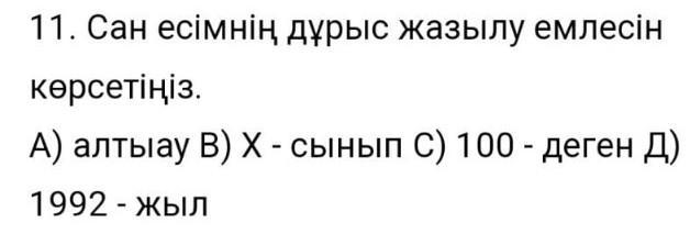 Сан есімнің дұрыс жазылу емлесін көрсетіңіз. А) алтыау В) X - сынып С) 100 - деген Д) 1992-жылПомогите пожалуйста мне