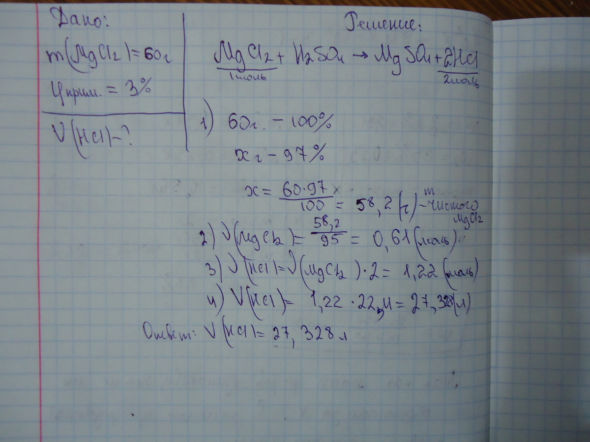 Определите объем хлороводорода, который можно получить из 60 г хлорида магния, содержащего 3% примеси.