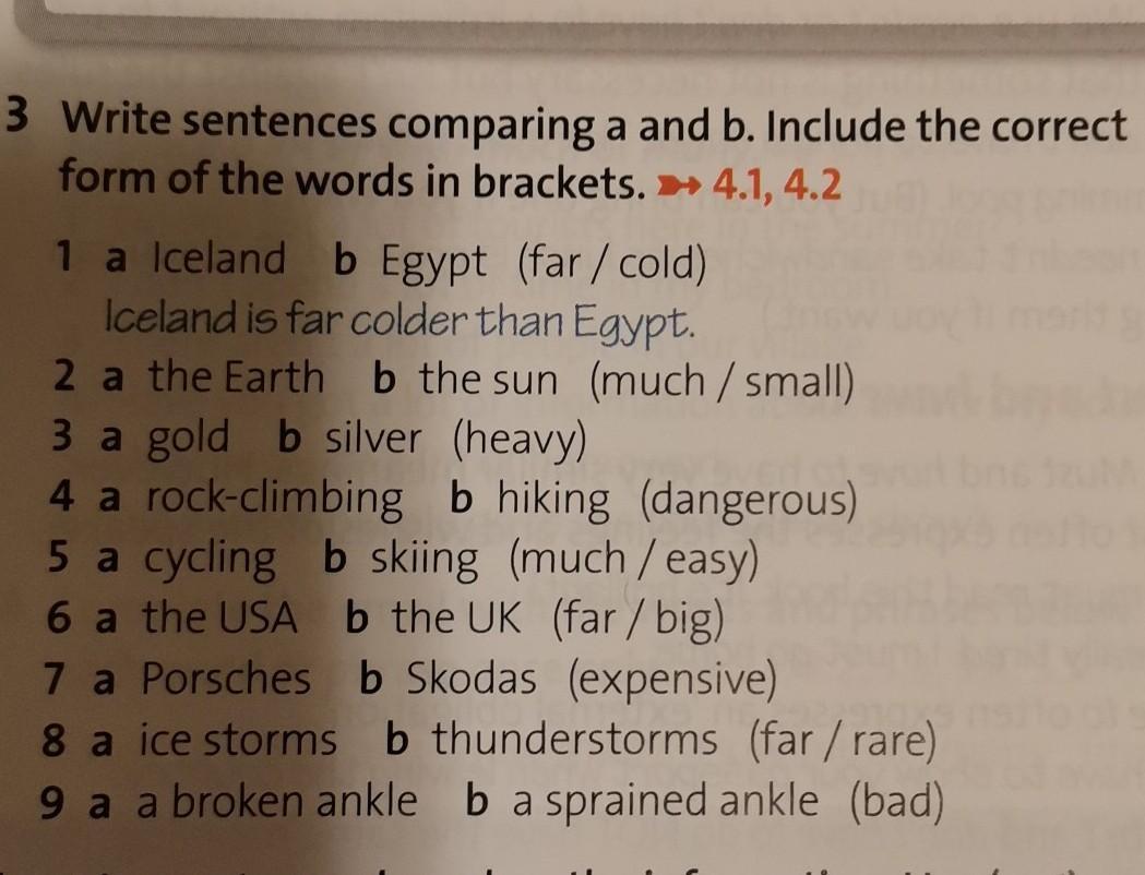 1 a Iceland b Egypt (far/cold) Iceland is far colder than Egypt. 2 a the Earth b the sun (much/small) 3 a gold b silver (heavy) 4 a rock-climbing b hiking (dangerous) 5 a cycling b skiing (much/easy) 6 a the USA b the UK (far/big) 7 a Porsches b Skodas (expensive) 8 a ice storms b thunderstorms (far / rare) 9 a a broken ankle b a sprained ankle (bad)