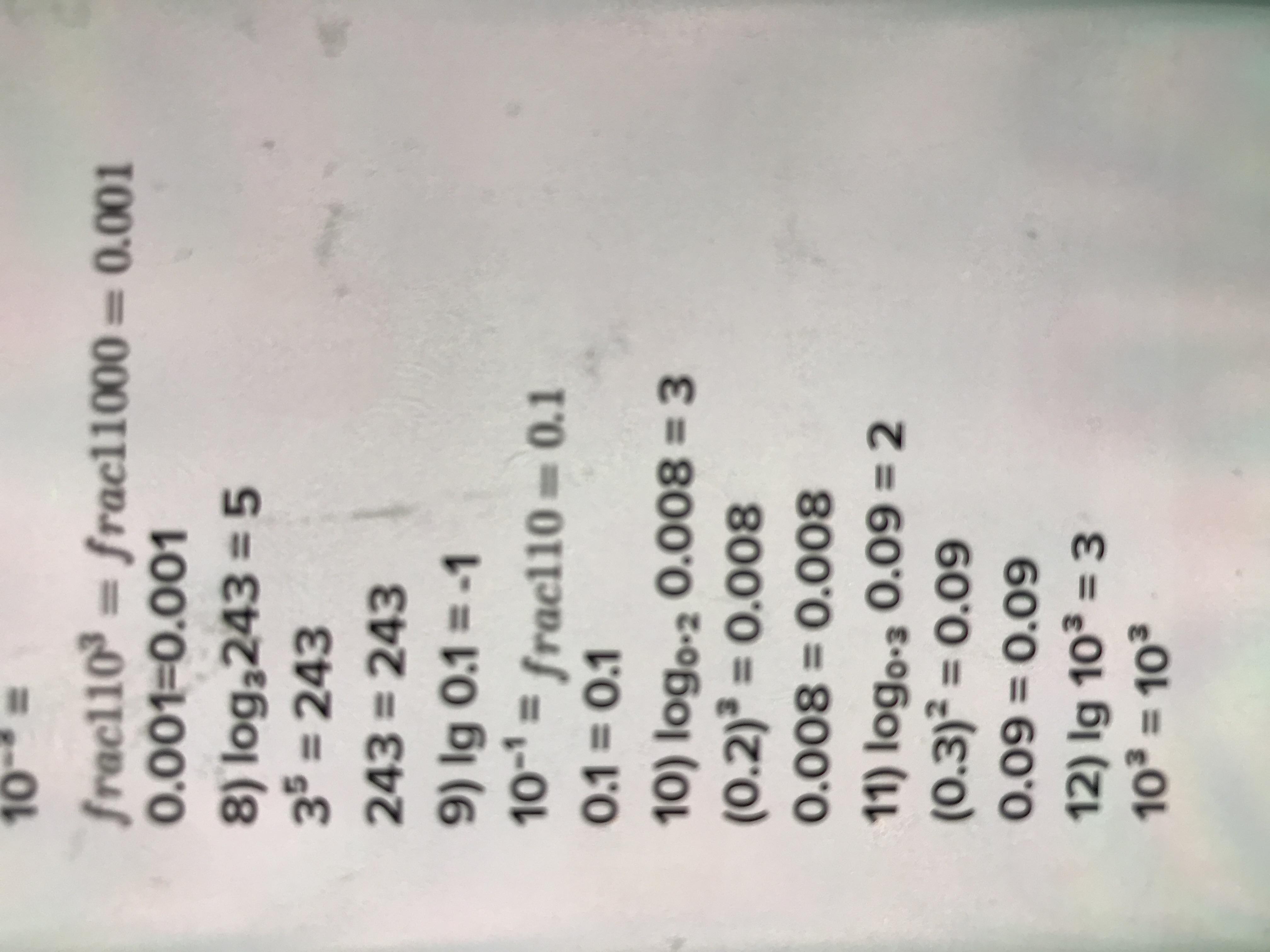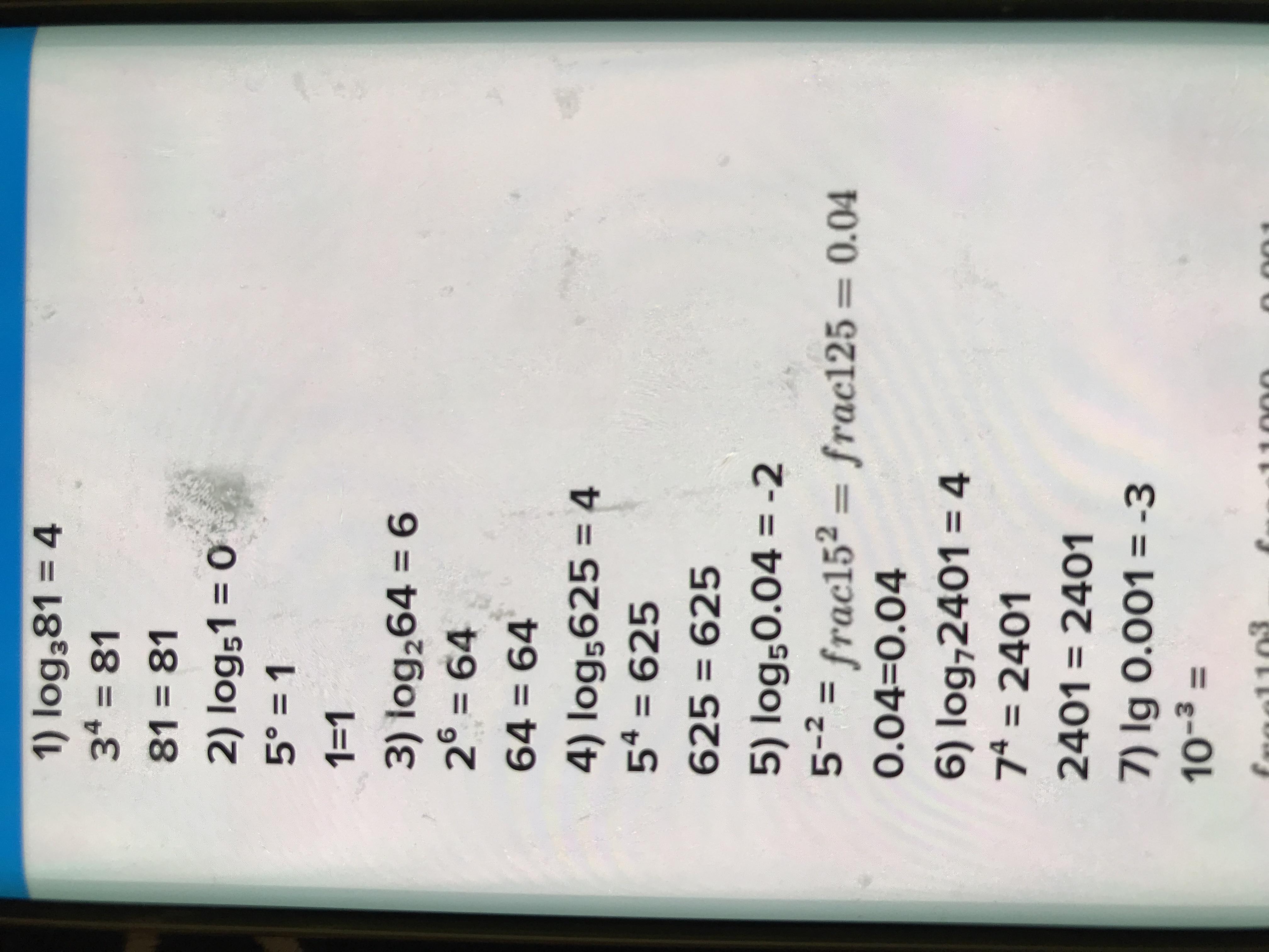 log3 81=4 log5 1=0 log2 64=6 log5 625=4 log5 0,04= -2 log7 2401=4 lg0,001=-3 log3 243=5 lg0,1=-1 log0,2 0,008=3 log 0,3 0,09=2 lg10^3=3 помогите пожалуйста срочно надо сейчас заранее спасибо