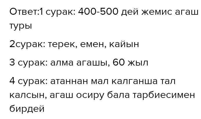 береик 3. Сұрақтардың жауабын мәтіннен тауып оқы. 1. Нұрғали ағаның бағында қанша жеміс ағашы бар? 2. Мақалада жеміс ағашынан басқа қандай ағаштар ата- лады? 3. Нұрғали аға ушiншi сыныпта қандай ағаш отырғызды? Ол ағаш нешiншi жыл есіп тұр? 4. Мақалада қандай өнегелі сөздер бар?