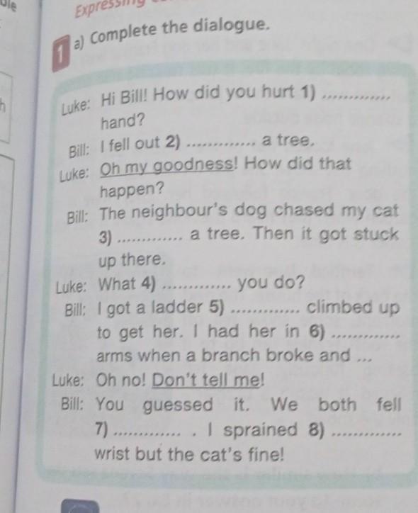 a) Complete the dialogue. Luke: Hi Bill! How did you hurt 1).......... hand? Bill: I fell out 2)............. a tree. Luke: Oh my goodness! How did that happen? Bill: The neighbour's dog chased my cat 3)............. a tree. Then it got stuck up there. Luke: What 4)......……..... you do? Bill: I got a ladder 5) ............. climbed up to get her. I had her in 6).............. arms when a branch broke and ... Luke: Oh no! Don't tell me! Bill: You guessed it. We both fell 7).............. I sprained 8).............. wrist but the cat's fine!
