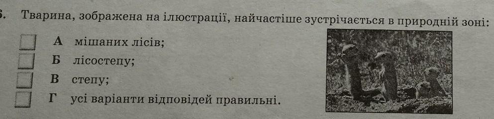 А мішаних лісів; 6. Тварина, зображена на ілюстрації, найчастіше зустрічається в природній зоні: Г усі варіанти відповідей правильні. В степу; Б лісостепу;