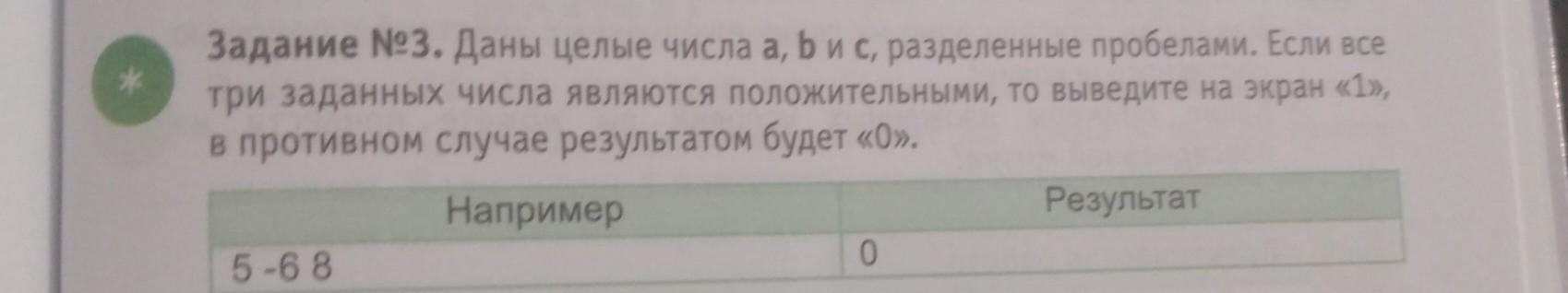 Задание №3. Даны целые числа а, b и с, разделенные пробелами. Если все три заданных числа являются положительными, то выведите на экран "1", в противном случае результатом будет "0".