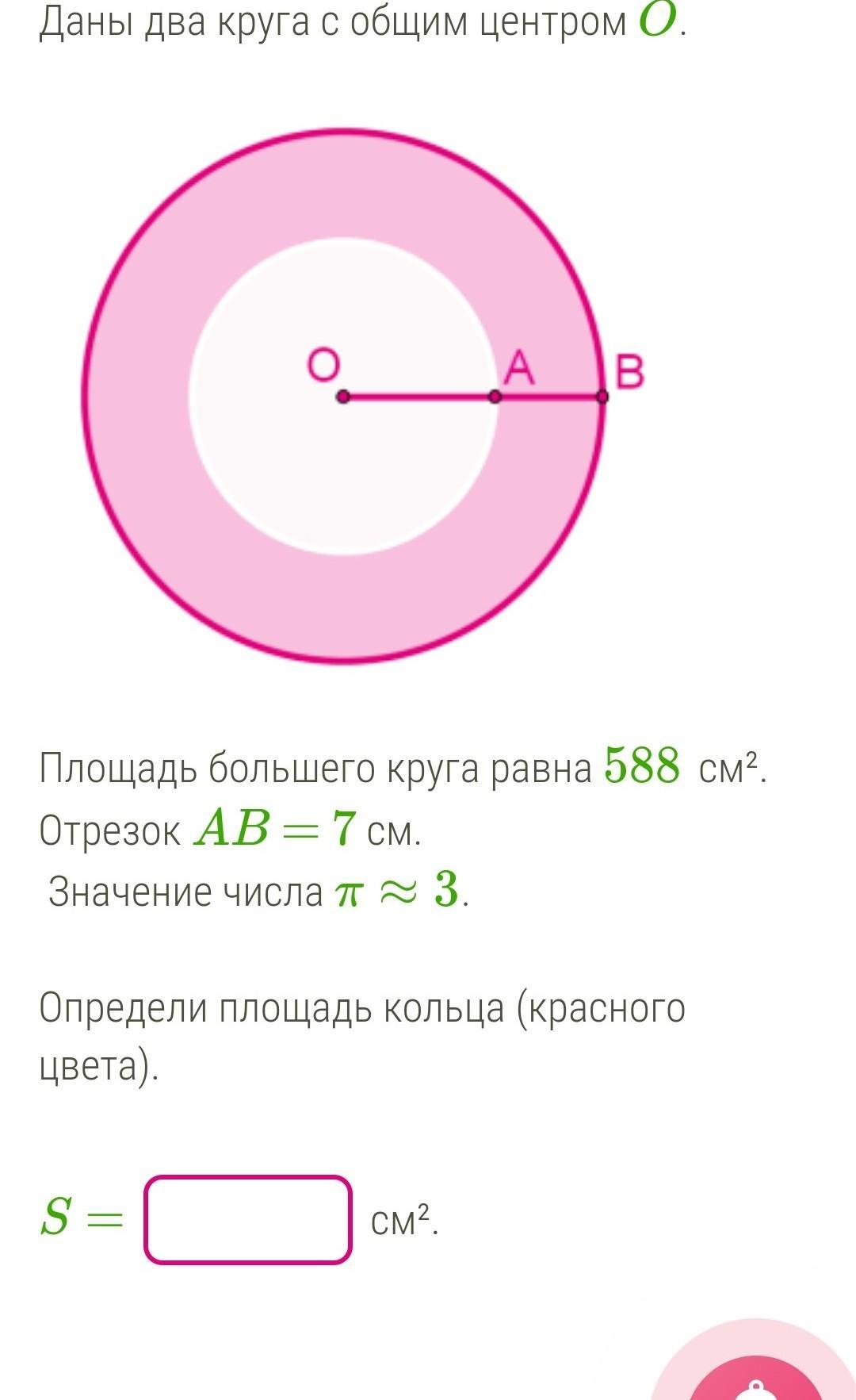 Площадь большого круга с радиусом R равна S₁ = π R² = 588 см² .