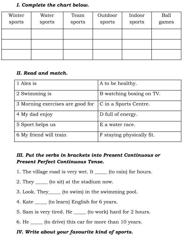 1.Winter sports: hokey; figure shating; snouboarding; beans; ice skating. Water sports: swimming; diving; water polo; marathon swimming; synchronized swimming. Team sports: basketball; football; hockey; tennis. Outdoor sports: skiing; basketball; archer; golf; hockey; football. Indoor sports: fencing; billiards; pole vaulting. Ball games: football; basketball; tennis