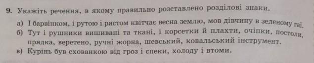 9. Укажіть речення, в якому правильно розставлено розділові знаки. а) I барвінком, і рутою і рястом квітчає весна землю, мов дівчину в зеленому гаї, 6) Тут і рушники вишивані та ткані, і корсетки й плахти, очіпки, постоли, прядка, веретено, ручнi жорна, шевський, ковальський інструмент. в) Курінь був схованкою вiд гроз i спеки, холоду і втоми.