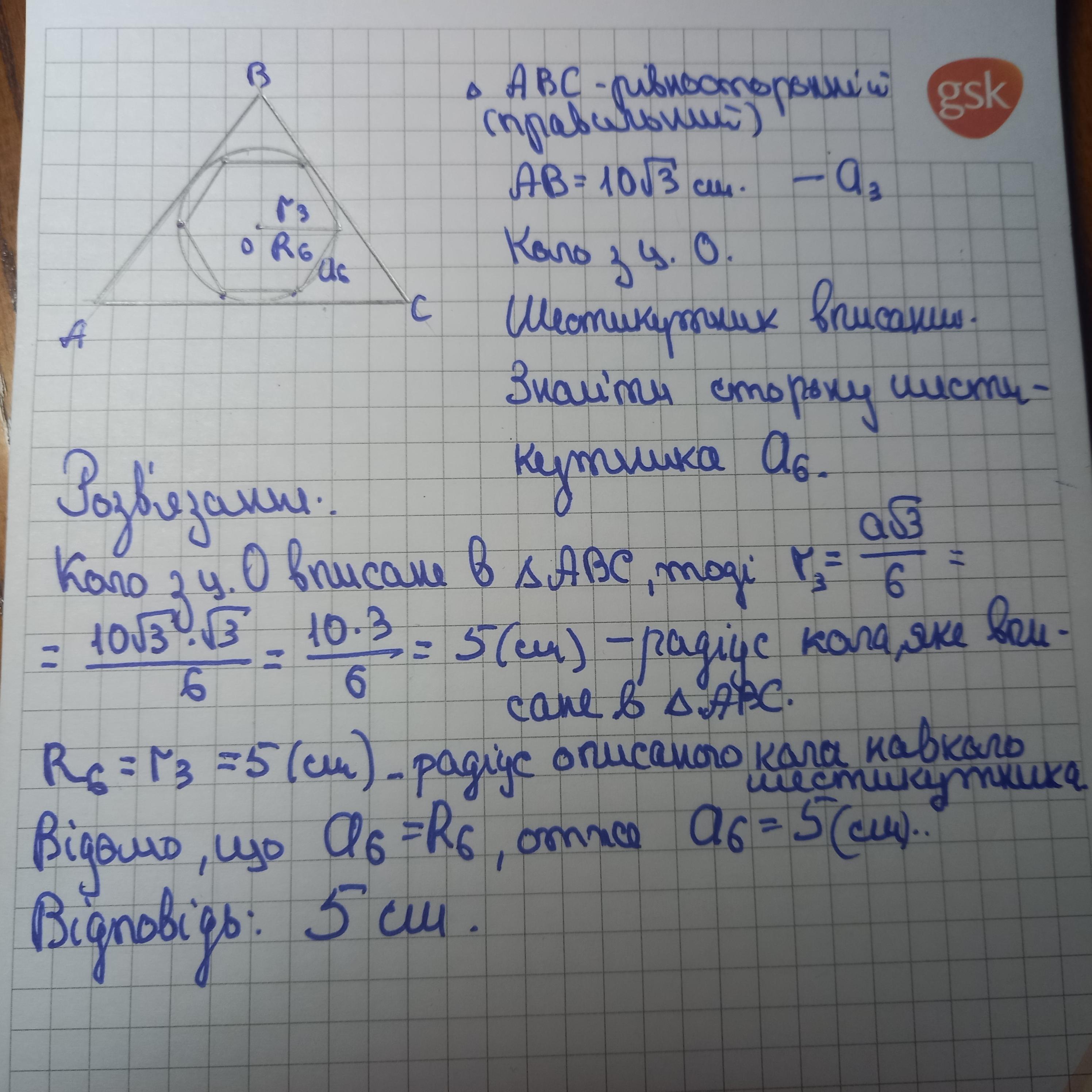 ^^знайдіть сторону правильного шестикутника, вписаного в коло, якщо сторона правильного трикутника, описаного навколо цього кола, дорівнює 10/3см^^