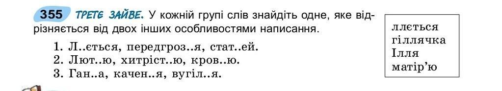 1. Л..ється, передгроз..я, стат..ей. 2. Лют..ю, хитріст..ю, кров..ю. 3. Ган..а, качен..я, вугіл..я. ллеться гіллячка Ілля матір'ю