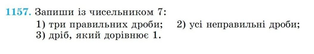 Запиши із чисельником 7: 1) три правильних дроби; 2) усі неправильні дроби; 3) дріб, який дорівнює 1.