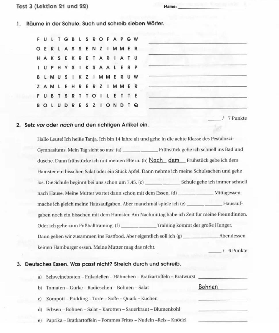 (d) Nach dem Mittagessen mache ich gleich meine Hausaufgaben. Aber manchmal spiele ich noch ein bisschen mit dem Hamster. Am Nachmittag habe ich Zeit für meine Freundinnen. Oder ich gehe zum Fußballtraining.