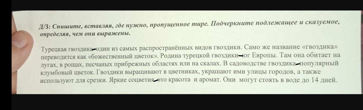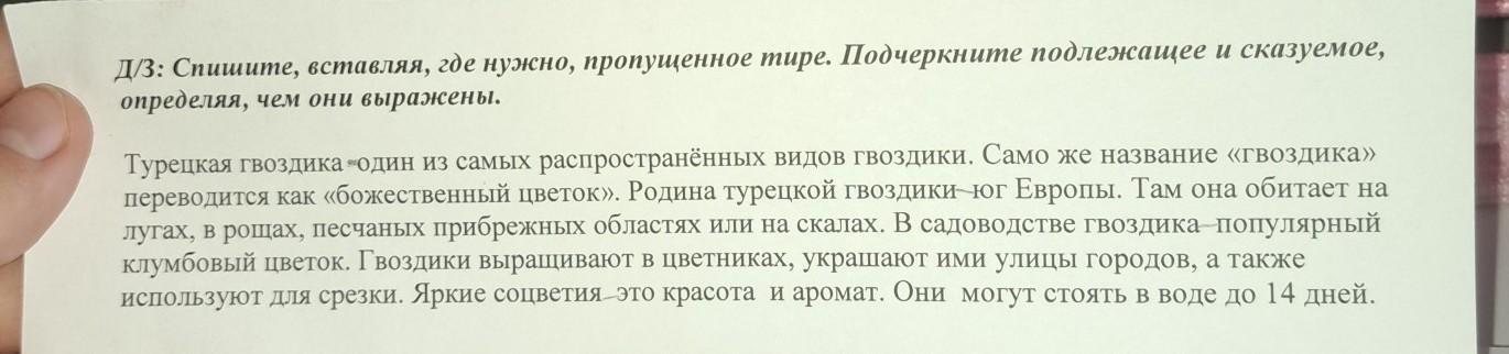 Спишите, вставляя, где нужно, пропущенное тире. Подчеркните подлежащее и сказуемое, определяя, чем они выражены. Турецкая гвоздика один из самых распространённых видов гвоздики. Само же название «гвоздика>> переводится как «божественный цветок». Родина турецкой гвоздики-юг Европы. Там она обитает на лугах, в рощах, песчаных прибрежных областях или на скалах. В садоводстве гвоздика популярный клумбовый цветок. Гвоздики выращивают в цветниках, украшают ими улицы городов, а также используют для срезки. Яркие соцветия-это красота и аромат. Они могут стоять в воде до 14 дней.