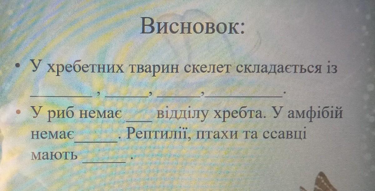 Відповідь: 1-осьового скелета; скелета кінцівок; скелета голови — черепа 2-зовнішнього вуха 3-ребер 4-голову, тулуб і хвіст