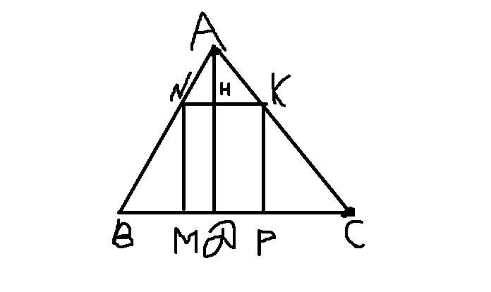 У трикутнику ABC BC=72 см, АД - висота, АД=24 см. У цей трикутник вписано прямокутник MNKP так, що вершини Мі Р належать стороні ВС, а вершини N і К - сторонам АB і AC відповідно. Знайдіть сторони прямокутнику, якщо |MP:MN=9:5.