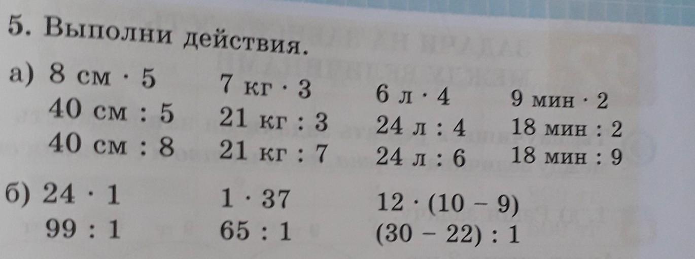 5. Выполни действия. а) 8 см · 5 7 кг · 3 21 кг : 3 21 кг : 7 40 см : 5 40 см : 8 6 л · 4 24 л: 4 24 л: 6 9 мин. 2 9 18 мин : 2 18 мин : 9
