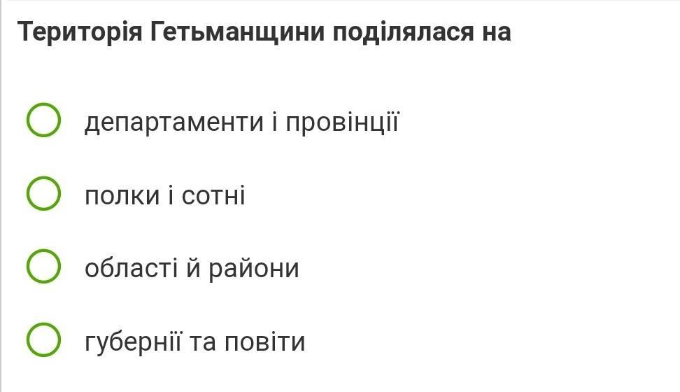 Територія Гетьманщини поділялася на департаменти і провінції полки і сотні області й райони губернії та повіти