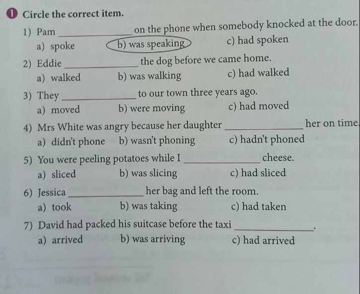 Circle the correct item. 1) Pam a) spoke 2) Eddie a) walked 3) They a) moved on the phone when somebody knocked at the door_ b) was speaking c) had spoken 6) Jessica the dog before we came home. a) took b) was walking 4) Mrs White was angry because her daughter a) didn't phone b) wasn't phoning to our town three years ago. b) were moving 5) You were peeling potatoes while I a) sliced b) was slicing c) had walked b) was taking c) had moved c) hadn't phoned cheese. c) had sliced her bag and left the room. c) had taken 7) David had packed his suitcase before the taxi a) arrived b) was arriving c) had arrived her on time
