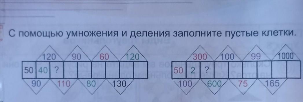 С помощью умножения и деления заполните пустые клетки. 300 100 99 120 50 40 ? 90 110, 90 .80 60 120 130, Han 0 50 2 ? 100, 600 75 1000 165