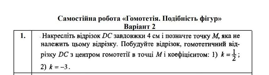 Накресліть відрізок DC завдовжки 4 см і позначте точку М, яка не належить цьому відрізку. Побудуйте відрізок, гомотетичний від- різку DC з центром гомотетії в точці М і коефіцієнтом: k= 1/2