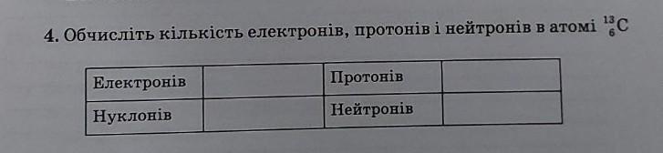 Атом ¹³C має 6 протонів (бо це його атомний номер), 6 електронів (якщо атом нейтральний, тобто не має заряду), та 7 нейтронів (бо атом має масове число 13, а масове число дорівнює сумі кількості протонів та нейтронів у ядрі).