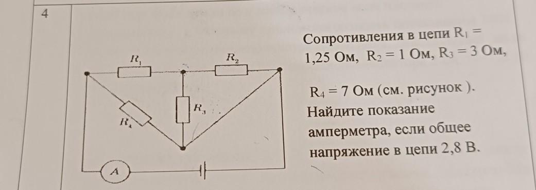 Сопротивления в цепи R = 1,25 OM, R2 = 1 OM, R3 = 3 Ом, R4=7 Ом (см. рисунок ). Найдите показание амперметра, если общее напряжение в цепи 2,8 В.