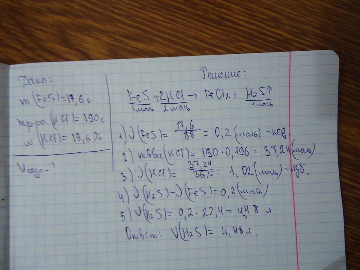 Определите объём газа, выделившегося при взаимодействии 17,6г сульфида железа (||) из 190г 19,6%-ного раствора HCl.