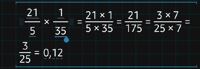 21/5×1/35=21 · 1/5 · 35=21/175=3 · 7/25 · 7=3/25 = 0.12
