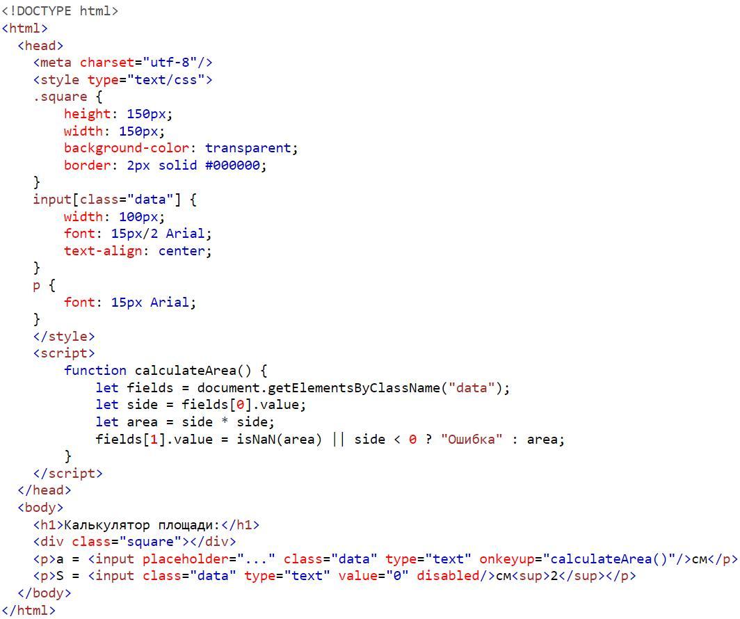 Помогите сделать правильный код в html по вычислению площади квадрата