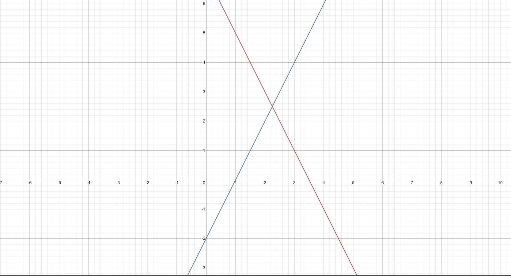 Побудуйте графіки функцій в одній системі координат у = – 2х +7, у = 2х - 2 Визначте в якій чверті