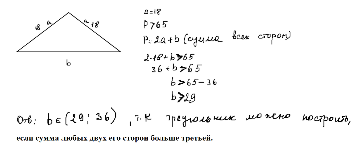 Длина боковой стороны равнобедренного треугольника равна 18 см ,а его периметр больше 65 см. Какую длину может иметь основание треугольника?