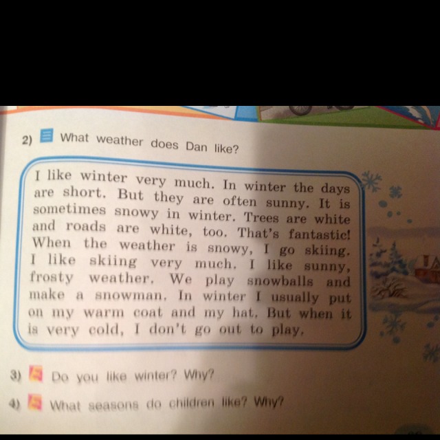 Как переводится. I like winter very much. In winter the days are short. But they are often sunny. It is sometimes snowy in winter. Trees are white and roads are white, too. That's fantastic! When the weather is snowy, I go skiing. I like skiing very much. I like sunny, frosty weather. We play snowballs and make a snowman. In winter i usually put on my warm coat and my hat. But when it is very cold, I don't go out to play.