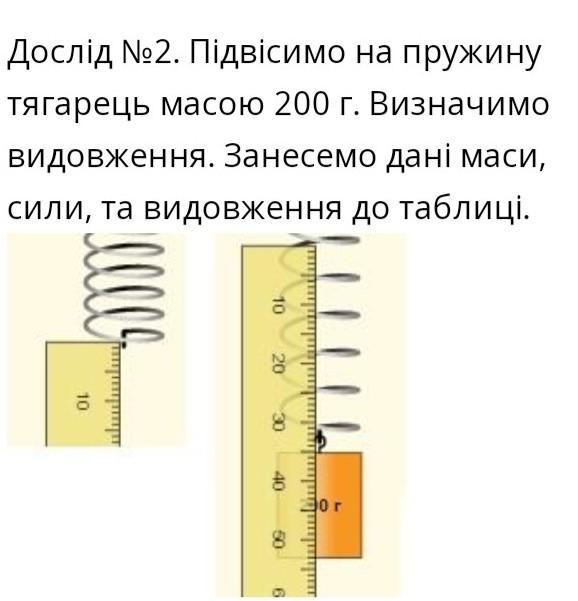 Дослід №2. Підвісимо на пружину тягарець масою 200 г. Визначимо видовження. Занесемо дані маси, сили, та видовження до таблиці.