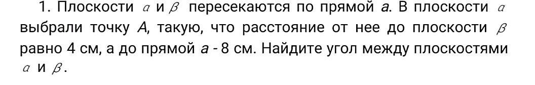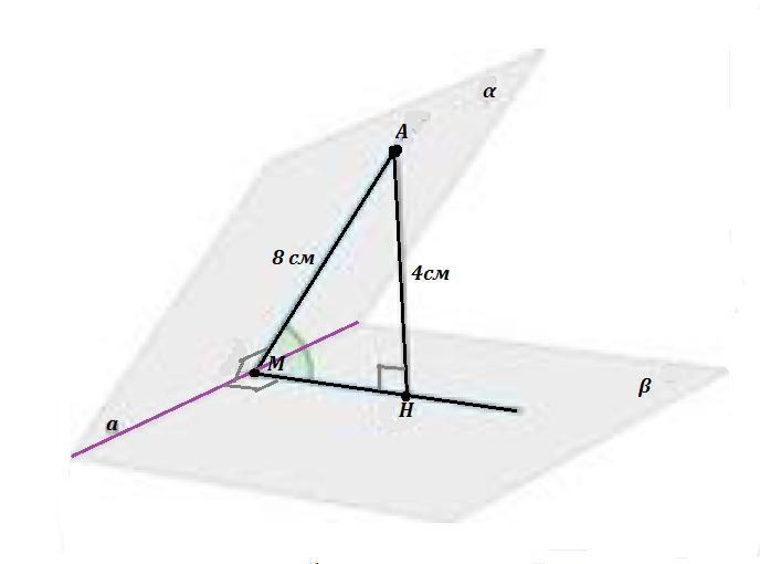 Угол между плоскостями α и β равен углу между прямой АМ и проекцией отрезка АМ на пл. β - отрезком МН .