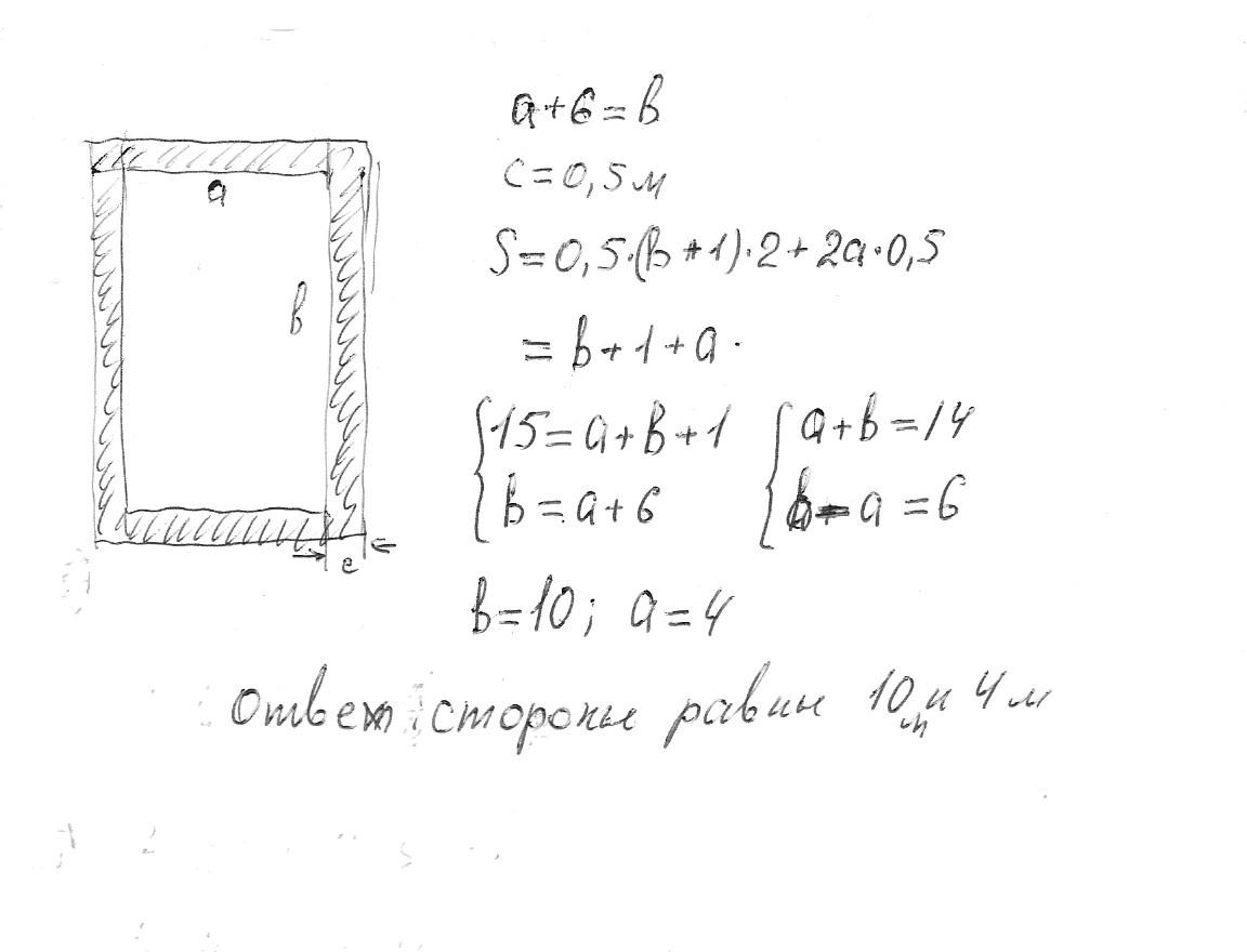 Бассейн имеет прямоугольную форму. Одна из его сторон на 6 м больше другой. Он окружен дорожкой, ширина которой 0,5 м. Найдите стороны бассейна, если площадь окружающей его дорожки 15 м2.......СРОЧНО !!!