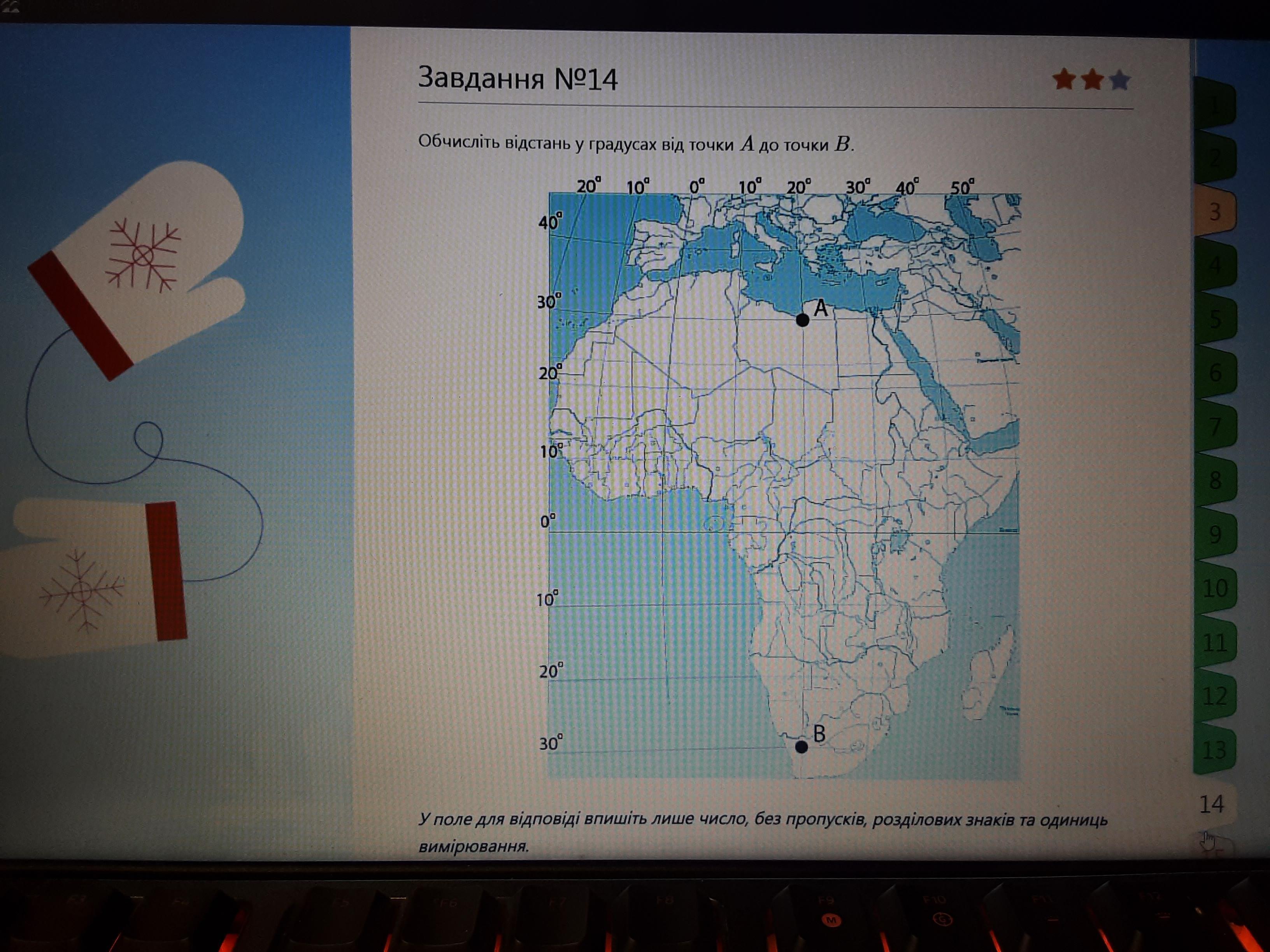 Обчисліть відстань від точки А до точки В у км. Знаючи, що 1° дуги меридіана дорівнюе цілому числу кілометрів