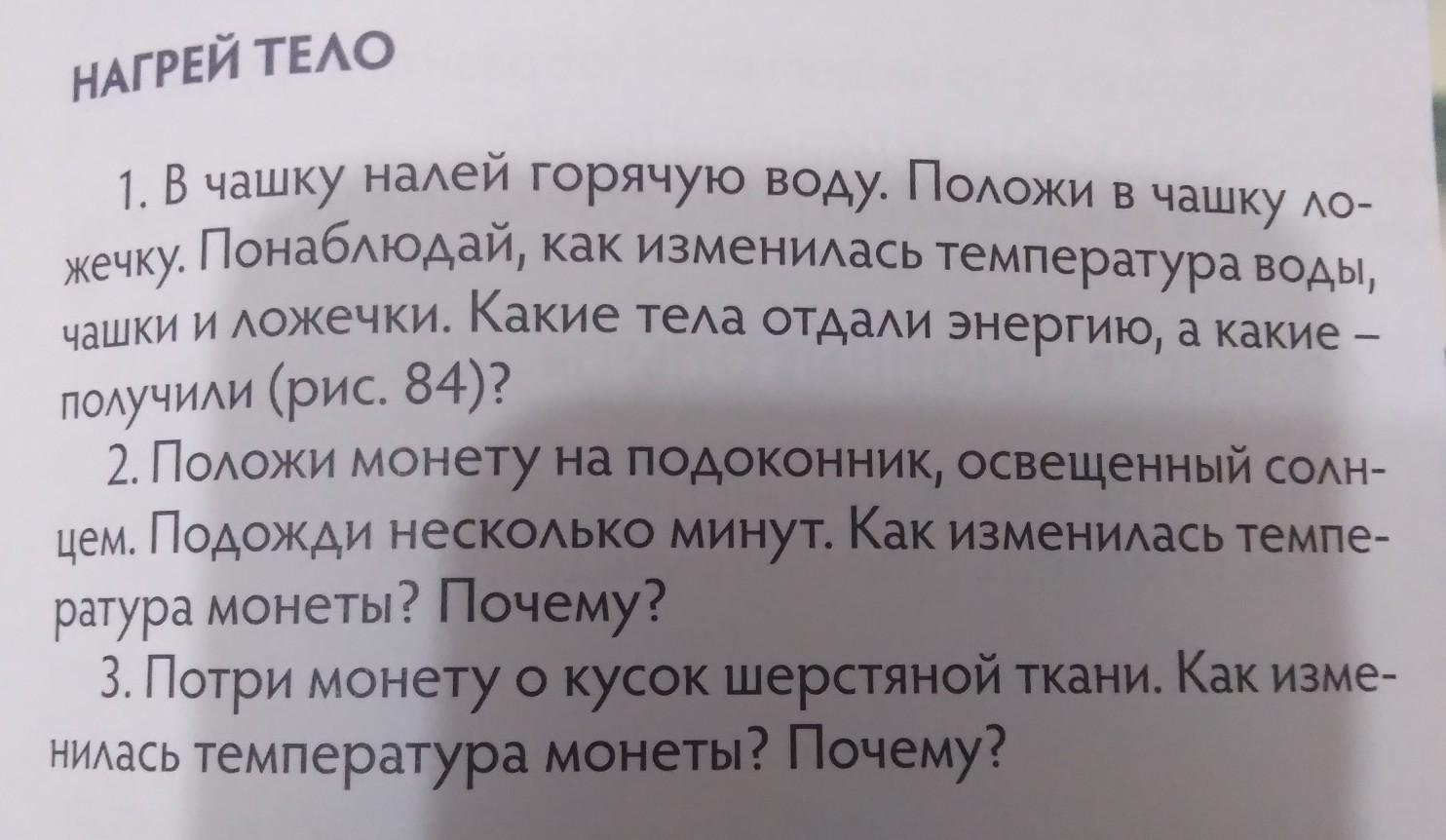 НАГРЕЙ ТЕЛО 1. В чашку налей горячую воду. Положи в чашку ло- жечку. чашки и ложечки. Какие тела отдали энергию, а какие- получили (рис. 84)? 2. Положи монету на подоконник, освещенный солн- цем. Подожди несколько минут. Как изменилась темпе- ратура монеты? Почему? 3. Потри монету о кусок шерстяной ткани. Как изме- нилась температура монеты? Почему? W