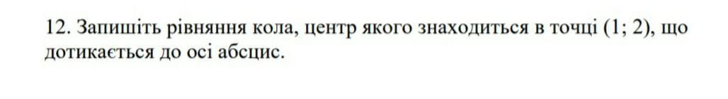 Рівняння кола має вигляд: , де точка О(a;b) - центр кола, R - радіус кола. Центр кола в нас вже є, треба знайти радіус. Коло дотикається до осі абсцис, отже відстань від осі абсцис до центра кола і буде радіусом кола. Ця відстань дорівнює 2 (координата у центра кола). Підставляємо значення a, b та R і отримуємо рівняння: