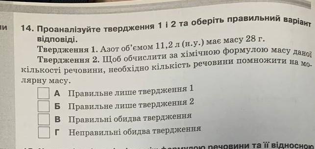 Отже, маса азоту об'ємом 11,2 л (н.у.) становить 14 г. Тому 1 твердження не правильне