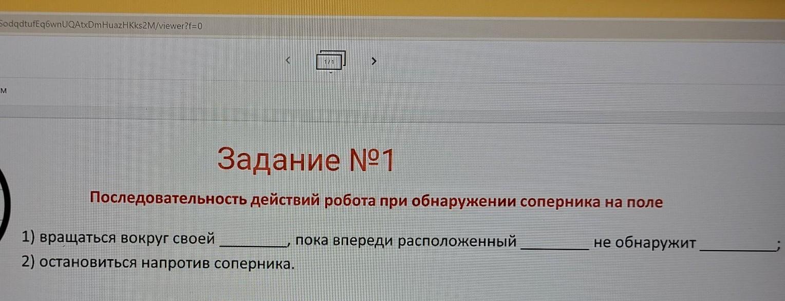 Задание №1 Последовательность действий робота при обнаружении соперника на поле не обнаружит пока впереди расположенный 1) вращаться вокруг своей 2) остановиться напротив соперника.