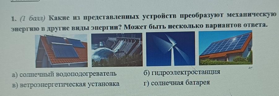 1.Какие из представленных устройств преобразуют механическую энергию в другие виды энергии? Может быть несколько вариантов ответа. a) солнечный водоподогреватель в) ветроэнергетическая установка б) гидроэлектростанция г) солнечная батарея???