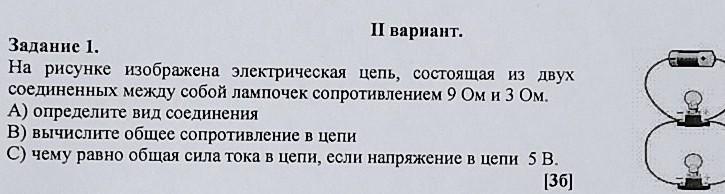 Задание 1. На рисунке изображена электрическая цепь, состоящая из двух соединенных между собой лампочек сопротивлением 9 Ом и 3 Ом. А) определите вид соединения В) вычислите общее сопротивление в цепи С) чему равно общая сила тока в цепи, если напряжение в цепи 5 в. ПЖПЖПЖЖПЖПЖ