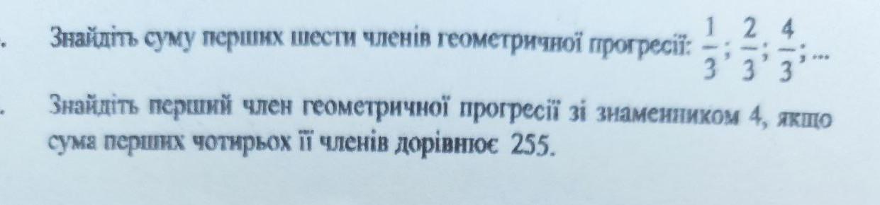Покрокове пояснення:1)Для нахождения суммы первых шести членов геометрической прогрессии нужно воспользоваться формулой:S_n = a * (1 - r^n) / (1 - r),где S_n - сумма первых n членов прогрессии, a - первый член прогрессии, r - знаменатель прогрессии (отношение любого члена к предыдущему), n - количество членов, для которых требуется найти сумму.В данном случае первый член прогрессии a = 1/3, знаменатель прогрессии r = (2/3) / (1/3) = 2, количество членов n = 6.Тогда сумма первых шести членов прогрессии будет равна:S_6 = (1/3) * (1 - 2^6) / (1 - 2) = (1/3) * (-63) / (-1) = 21Ответ: сумма первых шести членов геометрической прогрессии 1/3, 2/3, 4/3 равна 21.