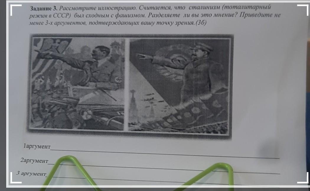 Рассмотрите иллюстрацию. Считается, что сталинизм (тоталитарный режим в СССР) был сходным с фашизмом. Разделяете ли вы это мнение? Приведите не менее 3-х аргументов, подтверждающих вашу точку зрения.(3б) D 1 аргумент 2аргумент 3 аргумент
